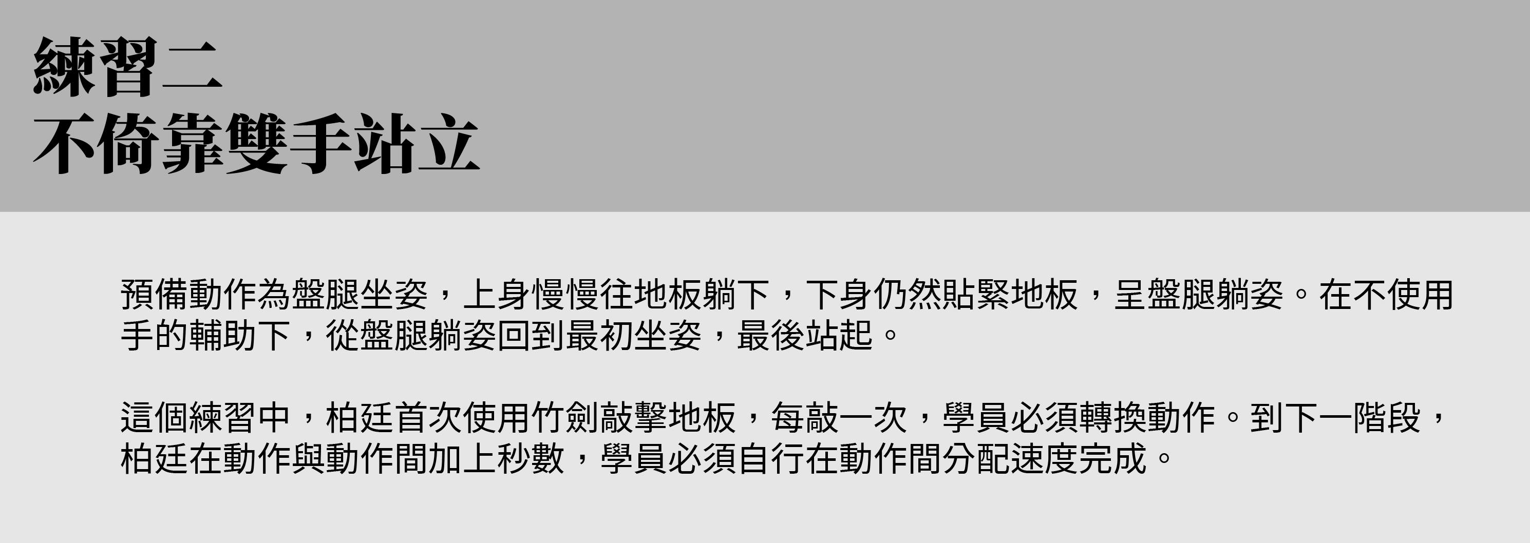 若說在肉體上最痛苦的練習,應就是坐姿雕塑了,坐骨可明顯感受承受全身重量的壓力,其餘的肌肉必須用力繃緊,尤其以腹部肌肉的發力最主要,一次練習往往就全身流汗濕透。練習時,柏廷使用竹劍大力敲擊地板發出指令,身體要快速轉換並停格,約莫十幾秒再切換至下個動作。