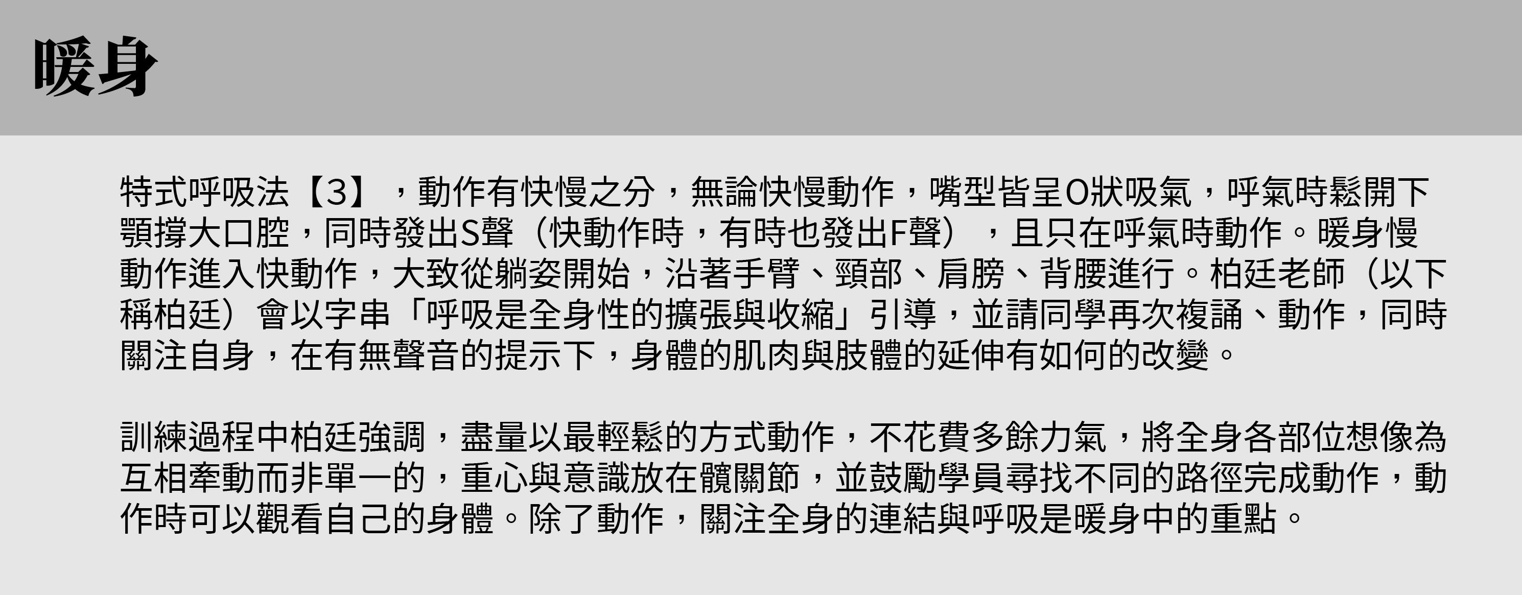 柏廷說,此次雖是鈴木忠志的工作坊,但他認為使用特式呼吸暖身相當適合。進行第一次完整的暖身後,身體不會酸痛,反而相當放鬆而平靜,有種善待自己的感覺。透過不斷的呼吸,將氣息保持在體內,動作時隱約可以感到氣流在身體裡流動,更隨著氣流察覺到身體各部位的連結。在進行快動作時,動作與動作間的吐氣是連續的,沒有吸氣的縫隙,有同學問要使用何種呼吸(腹式呼吸?胸式呼吸?),柏廷只說「做的時候你就知道了」,確實,太多的思考在快速的呼吸時幾乎派不上用場,柏廷的教學風格也偏向引導與啟發,而不直接給予「單一答案」。