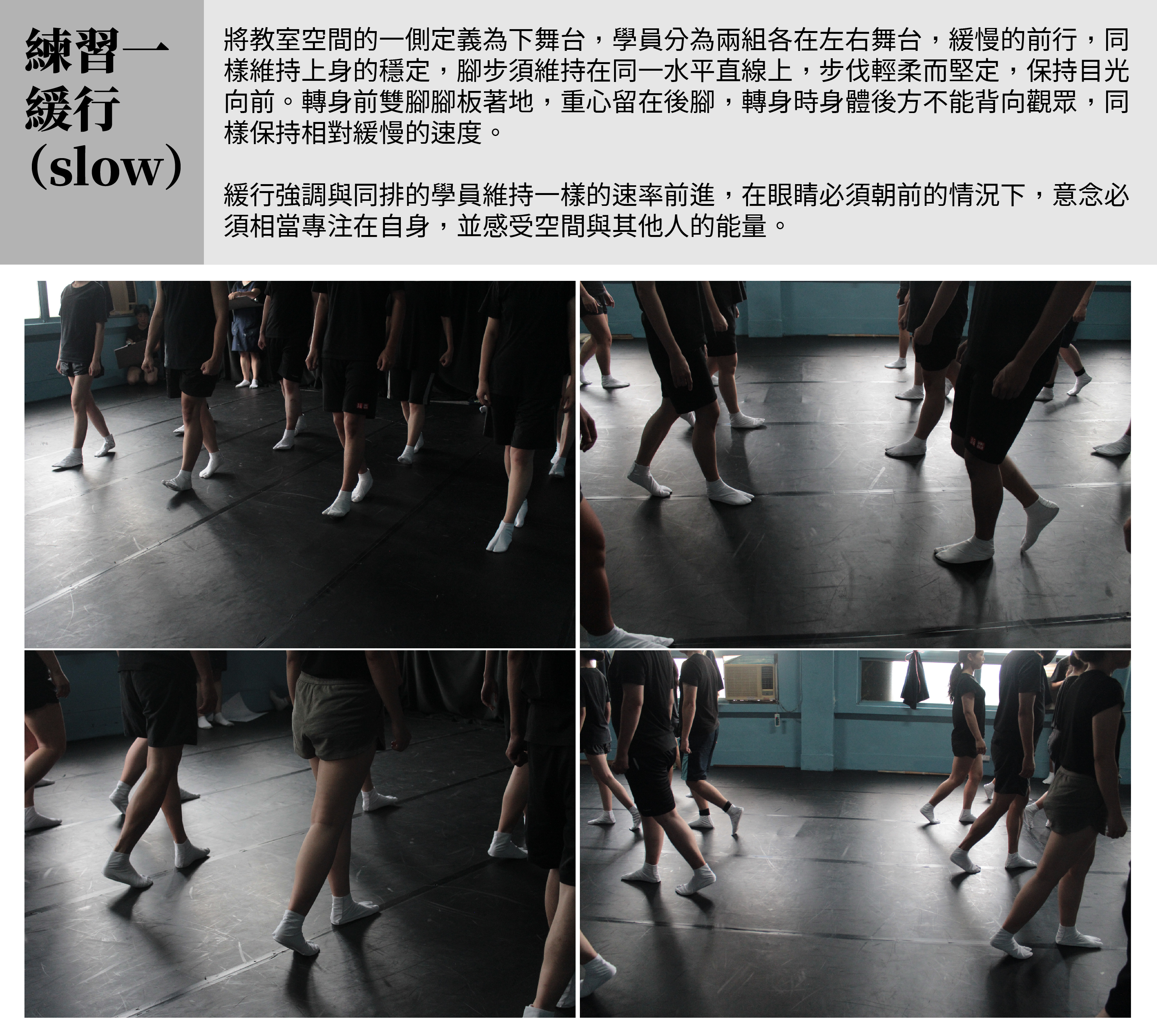 在柏廷與助教一同示範時,就能感受到相當強烈的戲劇性,當他們各自前進擦身走過,如同兩股強大的意念從衝突走到交會再分手。實際操作時,緩行並不像看起來那麼容易,人體行走時手臂原來就會擺盪,要「緩慢」的行走在同一直線,又不能晃動上肢時,仍需要倚靠核心肌群發力控制,看起來卻必須輕柔,第一次的行走不少學員都有行走速度過快的情況。