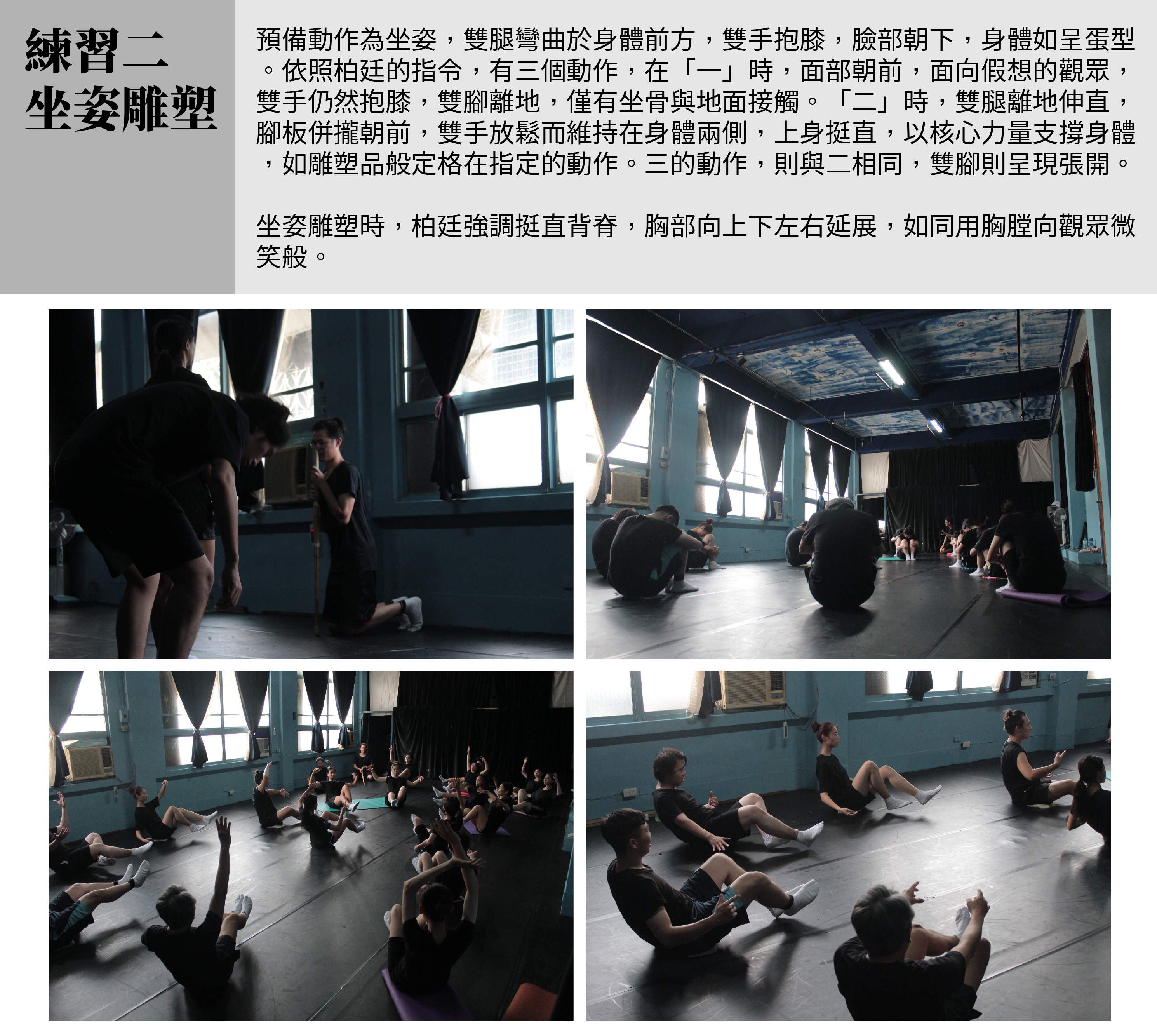 若說在肉體上最痛苦的練習,應就是坐姿雕塑了,坐骨可明顯感受承受全身重量的壓力,其餘的肌肉必須用力繃緊,尤其以腹部肌肉的發力最主要,一次練習往往就全身流汗濕透。練習時,柏廷使用竹劍大力敲擊地板發出指令,身體要快速轉換並停格,約莫十幾秒再切換至下個動作。