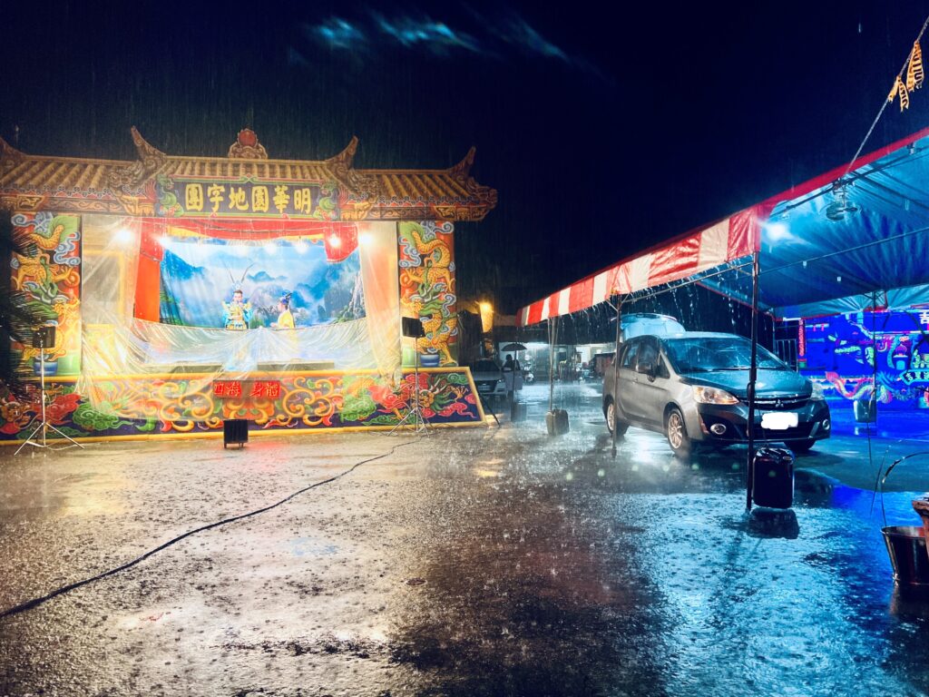 延續70餘年的香火,為感恩那位當初化解滅頂之災,在紅光中指引生路的神明,2025年盛夏,廟方依循傳統,於農曆6月23、24 兩日請地字團連演大戲酬神,並於24日正日當晚大擺平安宴。第一天夜戲正演出《明末血淚-崇禎出世》,請主在旁烤肉同樂,當晚我是唯一的觀眾。台上賣力演出,隔壁拚台是台南的布袋戲錄音班專演扮仙,無人的雨夜,僅有一人操偶的戲棚發出的藍光在旁陰鬱地亮著。